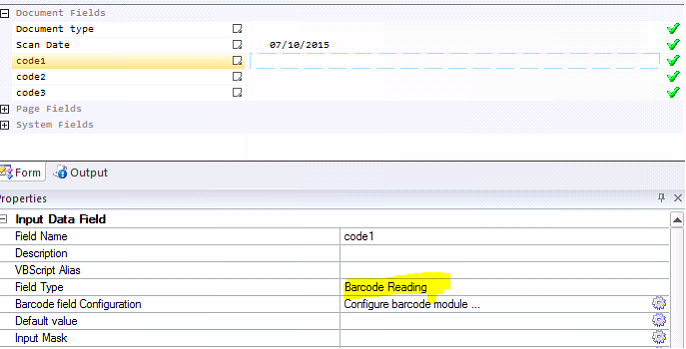 Three fields set to Barcode Reading are created.