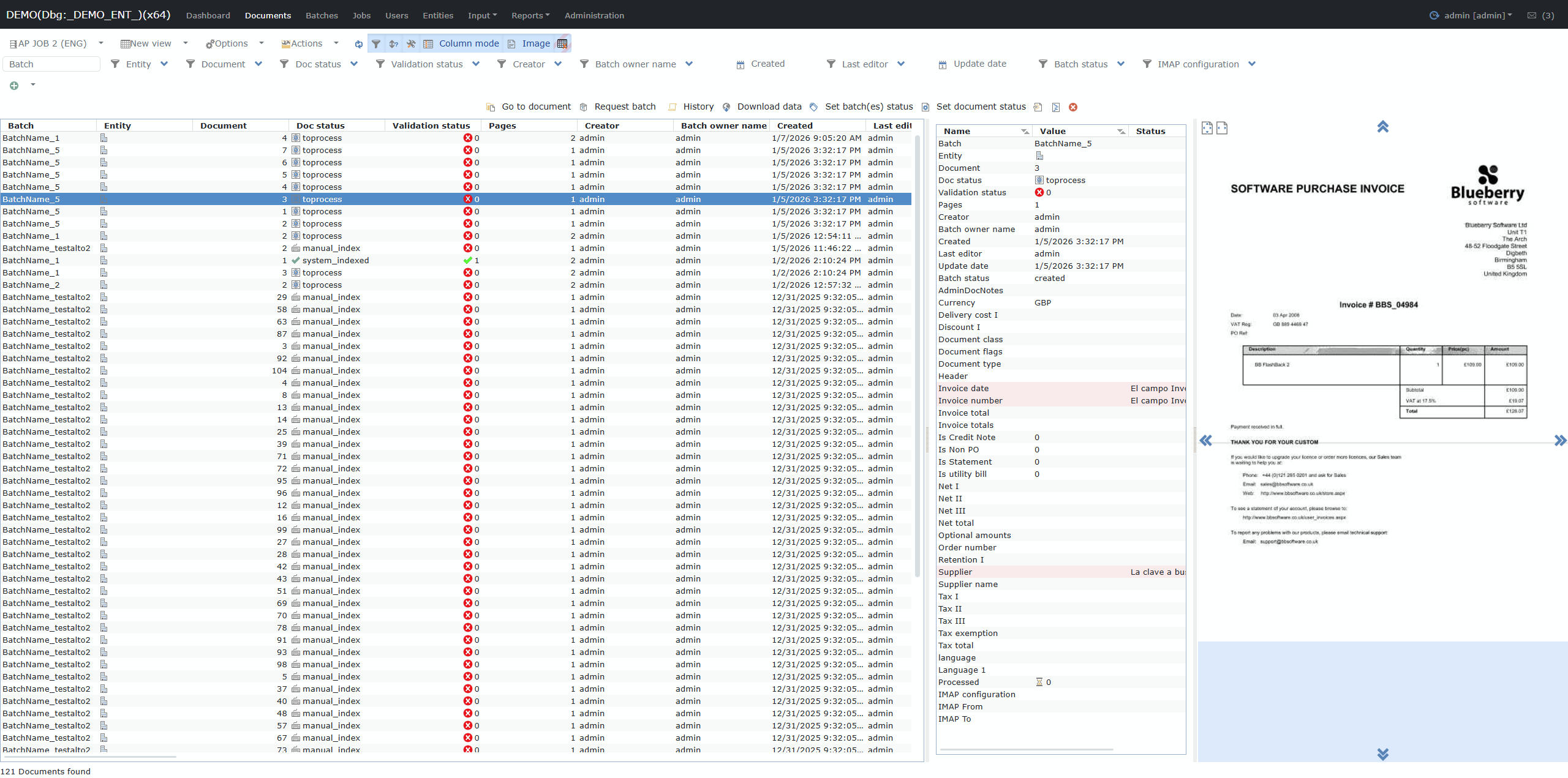 The Documents tab is your main workspace for viewing, searching, filtering, and validating all documents within the current job or batch. It provides: