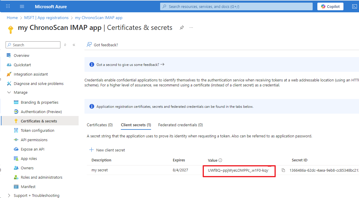 Once the secret is created it will show the value, copy the value because this will be the only time it will show the value
