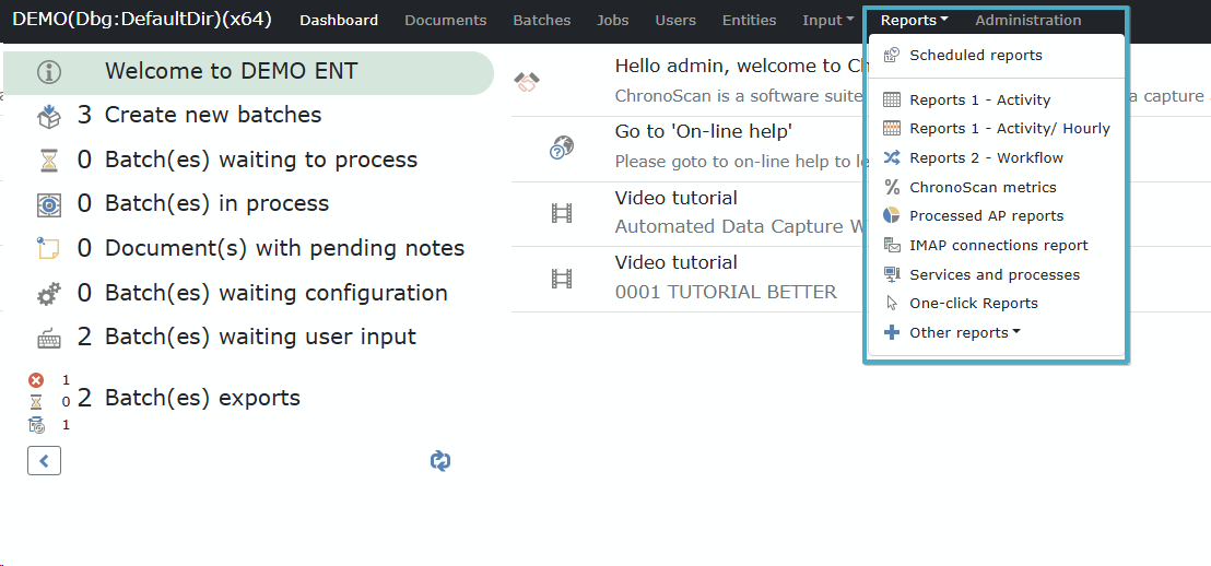 This section is designed for administrators and advanced users who need to access system activity logs, statistics, workflow summaries, and other operational reports.